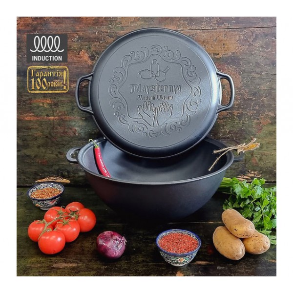 Казан 15 л узбецький з кришкою-сковорідкою WOK - виготовлений з 100% чавуну, є довговічним, термостійким та екологічним. Його форма з повним внутрішнім радіусом і потовщеним дном забезпечує рівномірне прогрівання та ідеальне тушкування. У комплекті чавунна кришка-сковорідка діаметром 40 см, яку можна використовувати як окрему жаровню. Посуд підходить для відкритого вогню, плити та духовки.