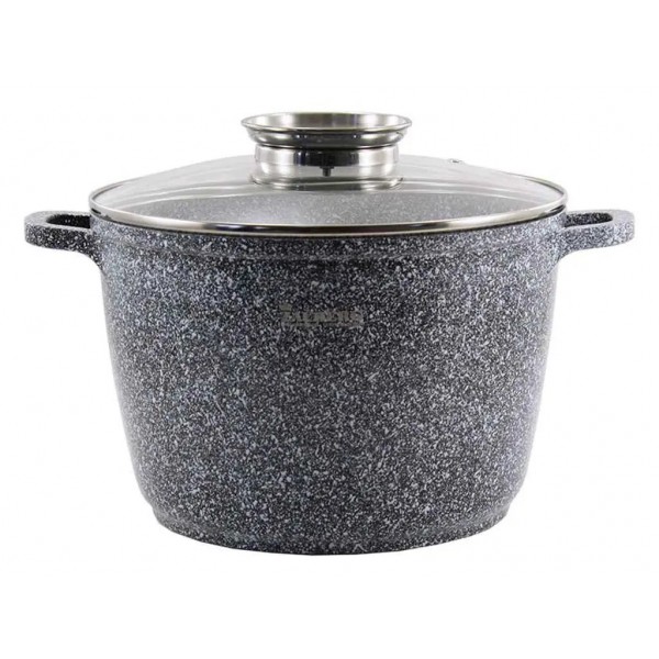 Каструля 10 л кругла Мармур арт.: 0628-SN - виготовлена з алюмінію, тепло в таких каструлях швидко розподіляється по всій поверхні. Внутрішнє покриття каструлі є антипригарним, їжа не буде прилипати до її стінок. Підходить для всіх видів плит, в тому числі індукційних. Має прозору зручну кришку з отвором для виходу пари. Каструля має сучасний дизайн, є функціональною та стильною.