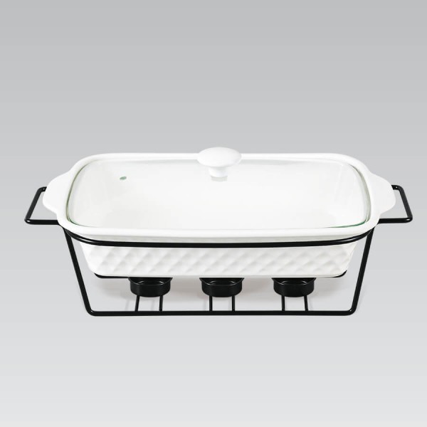 Марміт прямокутний 2,5 л виготовлений з кераміки, підходить для використання в мікрохвильовій печі та духовці. Корпус металевий з отвором для свічок. Має естетичний вигляд та практичний у використанні.