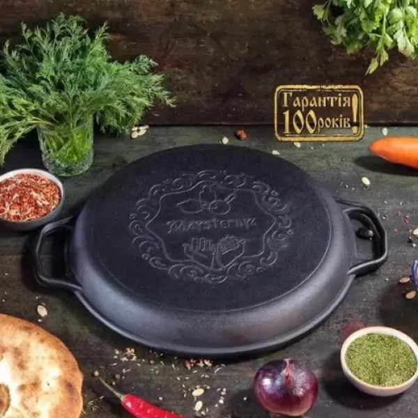 Жаровня чавунна лита 40×4 см арт.: 400-40Ук (S&T) - велика чавунна сковорода діаметром 40 см і висотою 4 см, ідеальна для смаження, тушкування та запікання. Завдяки литому чавуну вона рівномірно розподіляє тепло, зберігає температуру і підходить для всіх типів плит включно з індукцією та духовкою. Міцна конструкція без емалі дозволяє використовувати металеві лопатки, а натуральне антипригарне покриття з запеченого масла забезпечує довговічність і безпечне приготування.