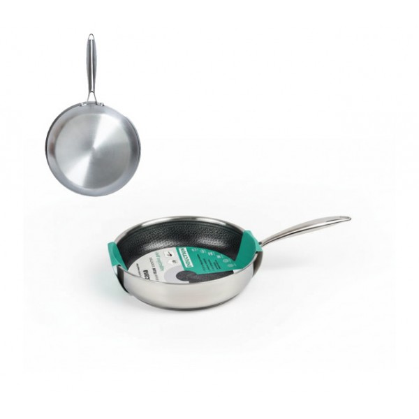 Сковорода 24 см з антипригарним PFLUON покриттям - сковорода з тришаровим корпусом : внутрішня частина - текстурована нержавіюча стальз покриттям PFLUON, середній шар - алюміній для рівномірного нагріву, зовнішній - магнітна сталь для індукції. Покриття Titan Plus стійке до подряпин і дозволяє використовувати металеве кухонне приладдя.