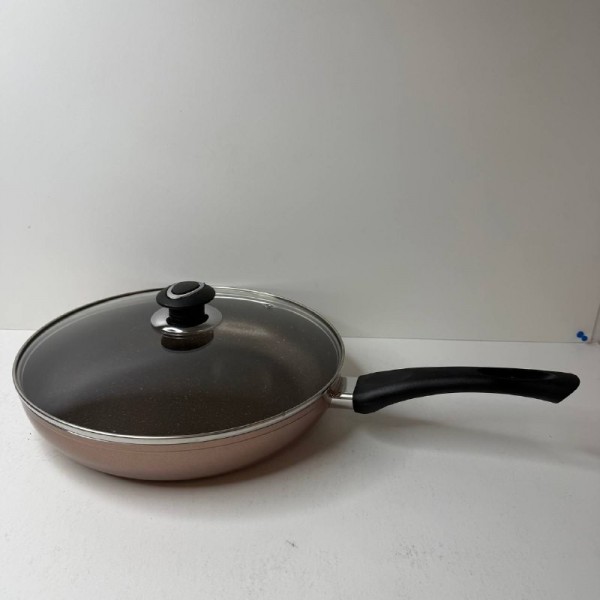 Сковорода 28 см алюмінієва зі скляною кришкою мармур - алюмінієва сковорода надійний помічник на кухні. Завдяки антипригарному покриттю їжа не прилипає, а індукційне дно забезпечує рівномірне прогрівання. Скляна кришка з отвором для пари зберігає тепло та дозволяє контролювати процес приготування.