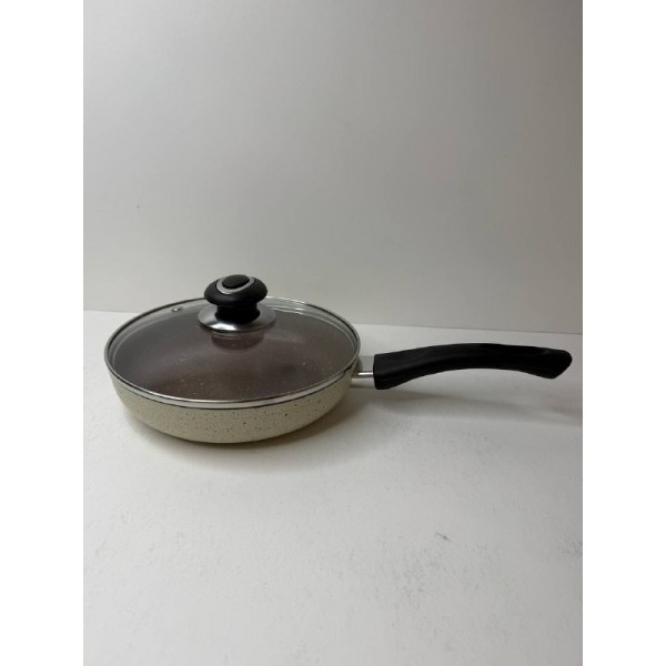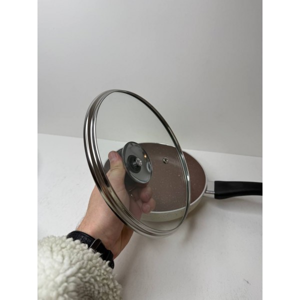 Сковорода 20 см алюмінієва зі скляною кришкою мармур - алюмінієва сковорода надійний помічник на кухні. Завдяки антипригарному покриттю їжа не прилипає, а індукційне дно забезпечує рівномірне прогрівання. Скляна кришка з отвором для пари зберігає тепло та дозволяє контролювати процес приготування.