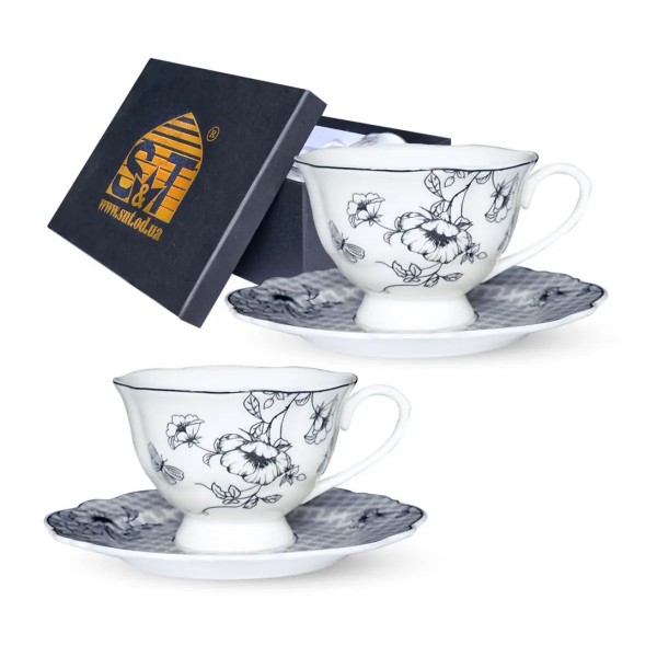 Набір чайний 4 предмети «Felix» - елегантний набір з 4 предметів, розрахований на 2 персони. Чашки обсягом 180 мл та блюдця 15,5 см виготовлені з білого фарфору з синьо-сірим орнаментом. Підходить для щоденного використання або для подарунка.