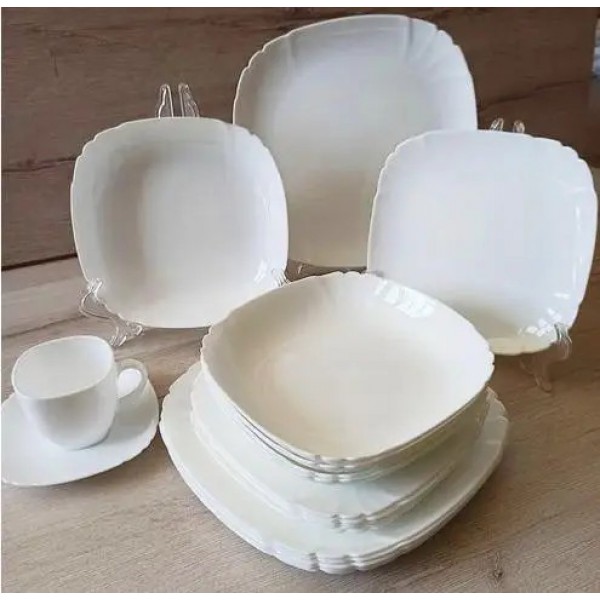 Lotusia сервіз столовий 18 предметів арт.: 3927 виготовлений з міцного ударостійкого скла, і є стійким до пошкоджень та подряпин. Виготовлений у класичному білому кольорі, підійде для будь якого інтер'єру.