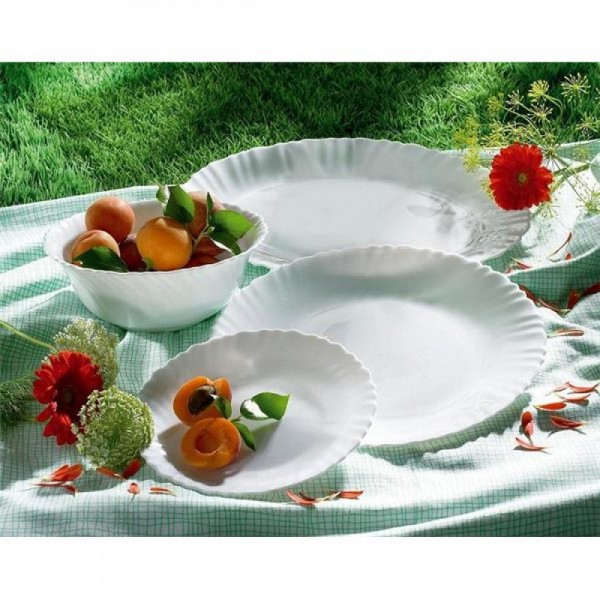 Feston сервіз столовий 26 предметів арт.: 5300 виготовлений з міцного ударостійкого скла, і є стійким до пошкоджень та подряпин. Виготовлений у класичному білому кольорі, підійде для будь якого інтер'єру.