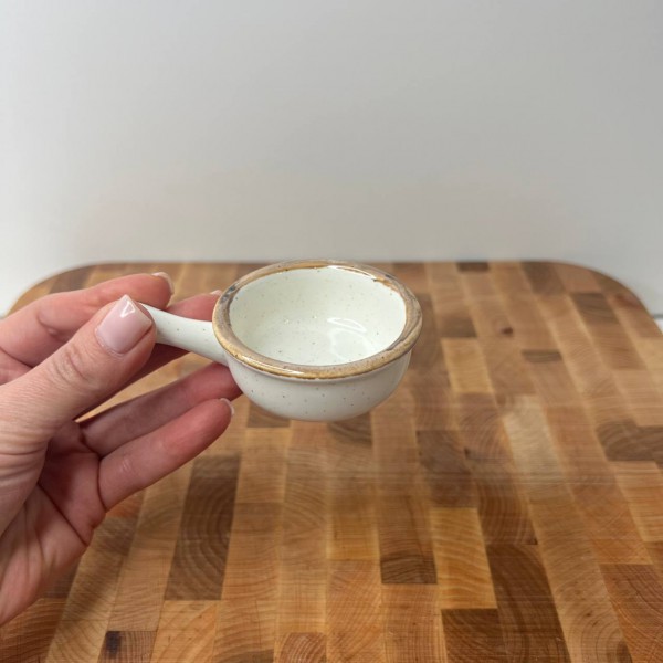 Соусник 8 см з ручкою Beige - виготовлений із глиноземистого фарфору, бежевого кольору із ручною глазур'ю та облямівкою. Стійкий до подряпин та перепадів температури. Підходить для використання в духовці, мікрохвильовій печі та морозильній камері.