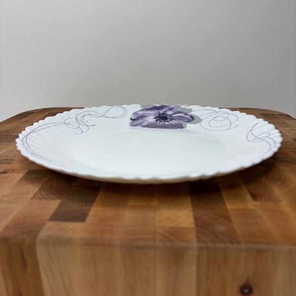 «Фіалка» тарілка 21 см № 8,5 хвилястий край - виготовлена з склокераміки з хвилястим краєм та декором квітів фіалки. Підходить для подачі основних страв чи десертів. Можна мити у посудомийній машині використовуючи делікатний режим, уникати абразивних миючих засобів та металевих щіток. Підходить для розігріву їжі у мікрохвильовій печі, але не рекомендується різкий перепад температур.